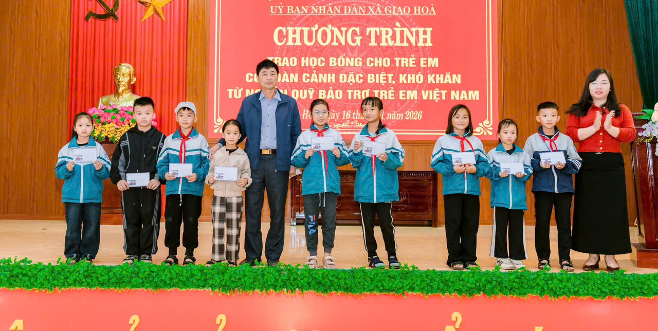 Ngày 16/01/2026, Chi cục Dân số và Trẻ em tỉnh Ninh Bình phối hợp với UBND xã Giao Hòa tổ chức trao học bổng cho 50 trẻ em có hoàn cảnh đặc biệt, khó khăn tại địa phương từ nguồn hỗ trợ của Quỹ Bảo trợ trẻ em Việt Nam. Hoạt động mang ý nghĩa nhân văn sâu sắc, thể hiện sự quan tâm thiết thực của các cấp, các ngành đối với thế hệ mầm non – những chủ nhân tương lai của đất nước.